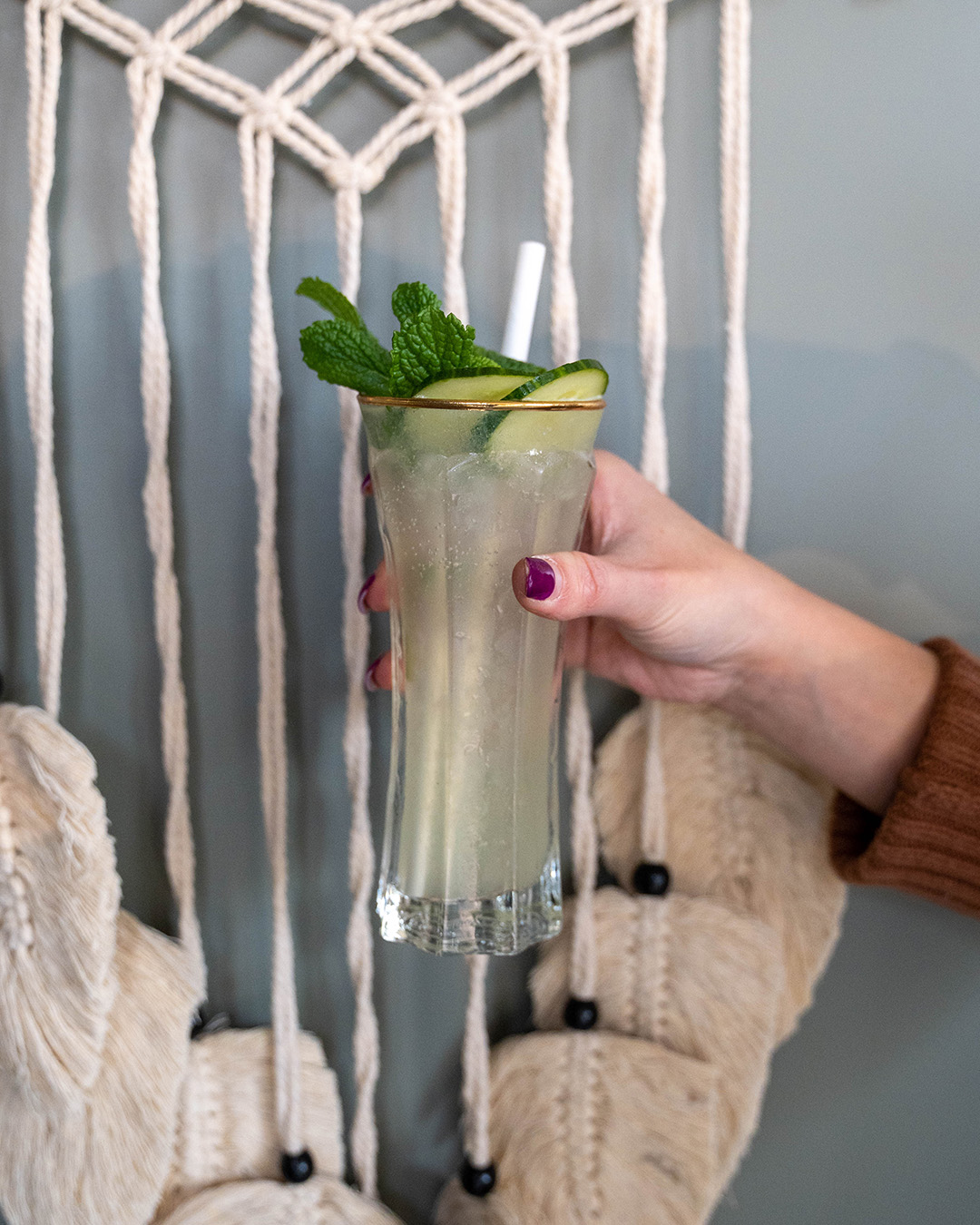Tequila Patron, St germain, Jus de citron, sirop de Kiwi, Menthe